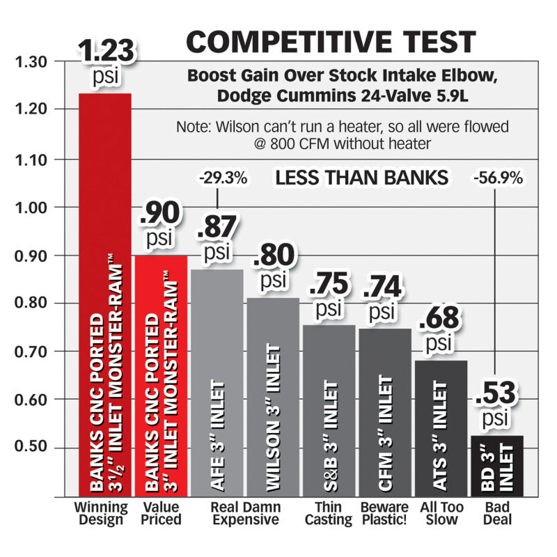 Monster-Ram improves airflow from the intercooler. Raises boost without increasing backpressure at the turbine. Result: a more responsive, fuel-efficient engine. Up to six 1/8 inch NPT ports for flexibility! At Banks Power, just enough is never enough when it comes to engine airflow. Maximum power, performance and efficiency are the ultimate goals, but to make it all happen the engine has to breathe freely and without needless restrictions. Finding ways to pump your engine full of cooler, denser air has always been the key. Our High-Ram intakes have always whipped the competition. Our new Monster-Ram flat-out destroys it. Utilizing the latest in electronic computational fluid-dynamic technology, tested on the flow bench as well as on the dyno, and finally proven in the real world where the rubber meets the road, Monster-Ram is a beast that only Banks could have unleashed. A simple, direct-replacement casting, Monster-Ram is instant power, performance and acceleration gratification. The factory inlet is cramped and angular compared to Banks' larger, streamlined cast-metal Monster-Ram. It's the perfect upgrade whether you're just starting out or working to build a serious, purpose-built machine. And with up to six ports for water/meth/propane/nitrous injection (or pressure/temp. sensors), the sky's the limit for performance expandability. Monster-Ram is CNC port-matched to the stock heater as well as the optional Banks Billet Intake Grid Heater Delete spacer. For maximum results, step-up to the Monster-Ram with Banks Boost Tube System. With up to six ports for water/meth/propane/nitrous injection (or pressure/temp. sensors), the sky's the limit for Monster-Ram's performance expandability.