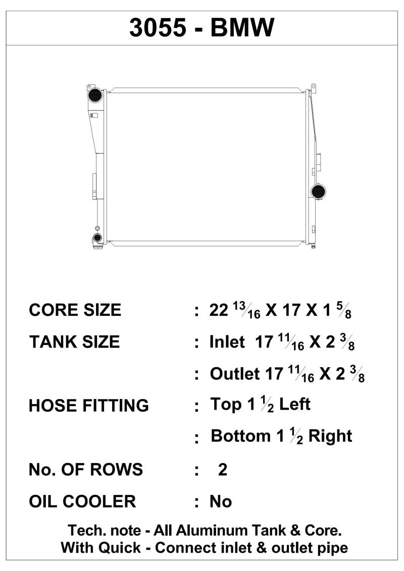 Get it all from CSF! With over 3000 models to chose from, CSF's coverage is second to none.When you choose CSF, you are dealing directly with the manufacturer, not a broker or an importer. CSF's factories are ISO certified, and are OE suppliers to many US, German and Asian manufacturers. When you purchase a CSF product, you can be rest assured that it has been manufactured on the same production lines with the same high quality standards as their OE customers. Every single radiator is subject to rigorous testing procedures such as Hydrostatic Testing, Vacuum decaying and life cycle testing, and is designed to always be a "drop-in fit".